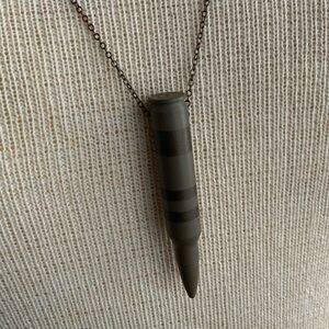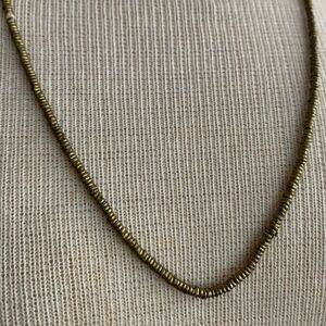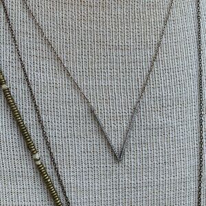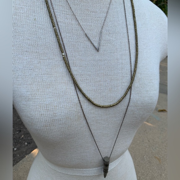 Separate pieces of delicate gold necklaces. Locally handcrafted bullet necklacewith long chain, Brass Heishi beaded necklace, and a V necklace designed by a local artist. This is a bundle or can also be purchased separately for $19 each or $39 for all 3.
