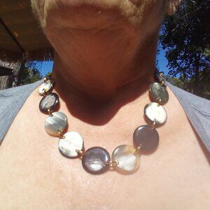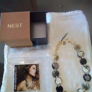 Beautiful horn disk necklace with gold accents. Made by "Nest" purchased from Saks for $195. Necklace is 19" long. Matching earrings listed under "earrings made of horn. Worn twice!