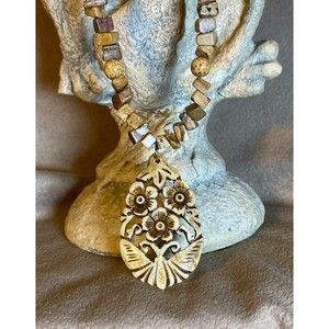 Necklace of Agate Chips With Butterfly and Flower Pendant This all natural necklace is so relaxed that the attention to color and detail just add to the easy vibes. The pendant is lightly dyed and shine coated.