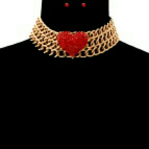Choker withe red heart/crystal stones/and crystal stone post earrings
