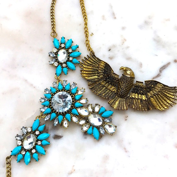 2 necklaces that are in pristine condition. Never been worn before, only used for display. Beautiful, bold and bright colors for one and rustic gold tone for the other. These are statement pieces