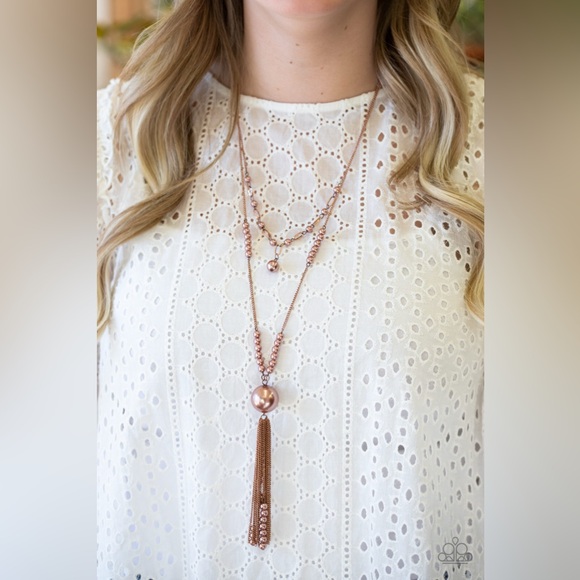 A collision of coppery pearls and copper chains drape across the chest, creating elegantly mismatched layers. An oversized copper pearl swings from the bottom of the lowermost chain, giving way to a tassel of stacked coppery pearls and free-falling copper chains. Features an adjustable clasp closure.