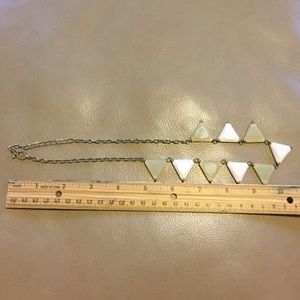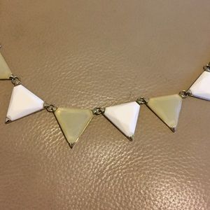 Necklace sits around true collar bone. Cream and white colors.