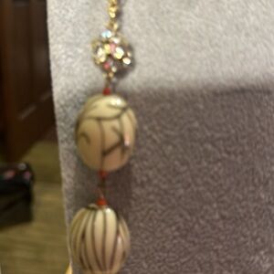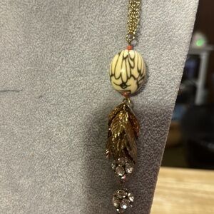 Necklace very beautiful. It has gold leaves. It has sparkly diamond like chips on it beads various colors and red spacers. This is not been signed. At the bottom is a beautiful mesh chain. The dimensions on this necklace are 16 inches long.