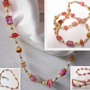 Pink &White & Gold beaded Necklace w/Gold metal Accents