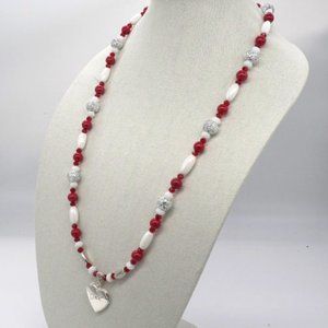 Necklace with Heart Locket, white and red beads. Lobster clasp.