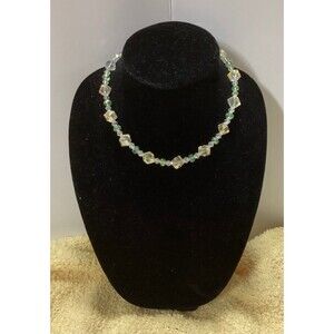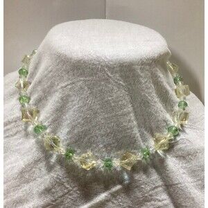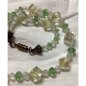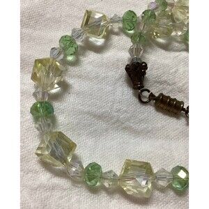 This is a simply but elegant glass beaded necklace. The beads are green, yellow and clear in several different shapes. Length is 17 inches long with a sturdy magnetic clasp. No makers mark and I have no,idea the age of the piece. In very good, clean condition.