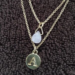 Has letter "A" on one chain, tear shaped stone on the other. Chains connect to form one necklace. Never worn