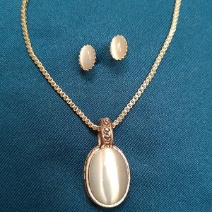 Necklace with two sides stone. One side white the other tinted blue. Two pairs of earings to match each side. Necklace 18".