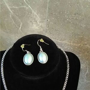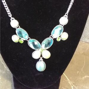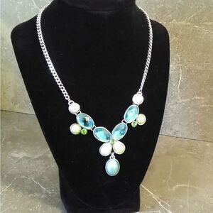 Beautiful Robin's egg blue and cream jewels with light green rhinestones. Matching earrings Heavy chain 17" chain with 3" extender