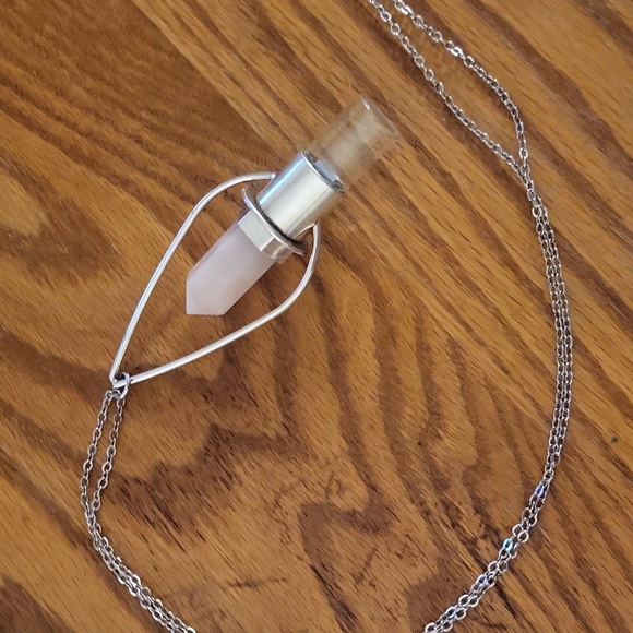Silver chain with rose quartz crystal and chamber for diffusing essential oils. Brand new and unused. beautiful edition for home decor or wearing as jewelry.