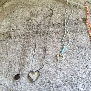 Assortment of necklaces. Two beaded -all real beads. Black tear drop stone. Smokey crystal circle stone. Sterling silver and cubic z diamond heard necklace. All prices negotiable