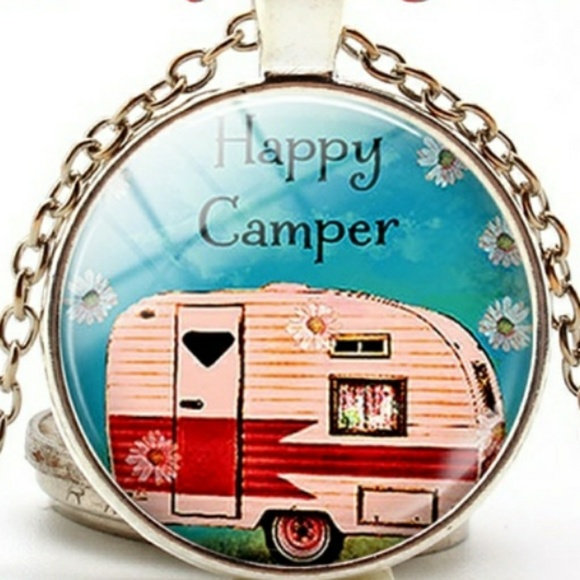 Cute Happy Camper necklace! ☺🌸 Glass Cabochon and 2 Silverstone and 2 black.