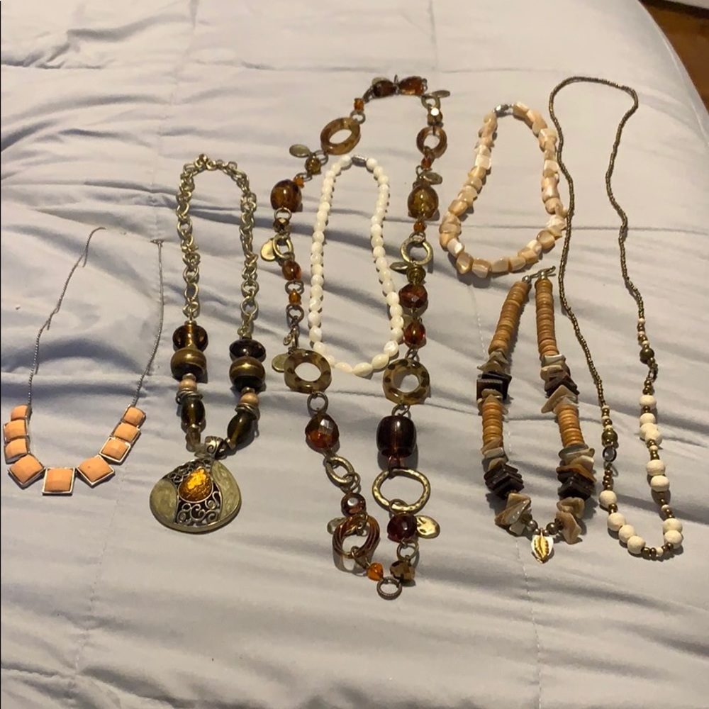 This lot of 7 necklaces has tortoise shell and neutral tones. Different styles. Please see photos for a closer look.