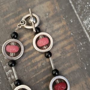 Stunning piece, purchased from an upscale boutique. Custom clasp and quality beads make this a one of a kind. Wear casually or for a special event. Metal on this piece is silver.