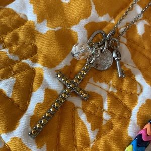 One with cross & multiple other tiny charms. Silver finish.