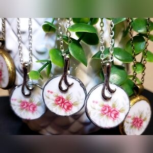 Handmade Pendant made from Broken China. I make each one by hand. Each one is Unique and one of a kind. I am able to make multiple Pieces from the same China Plate. Beautiful PRETTY PIECES. Which gives you the opportunity to gift these Pendants that are from the same China to family and friends. Making them a matching Sentimental Necklace Piece.