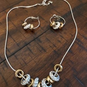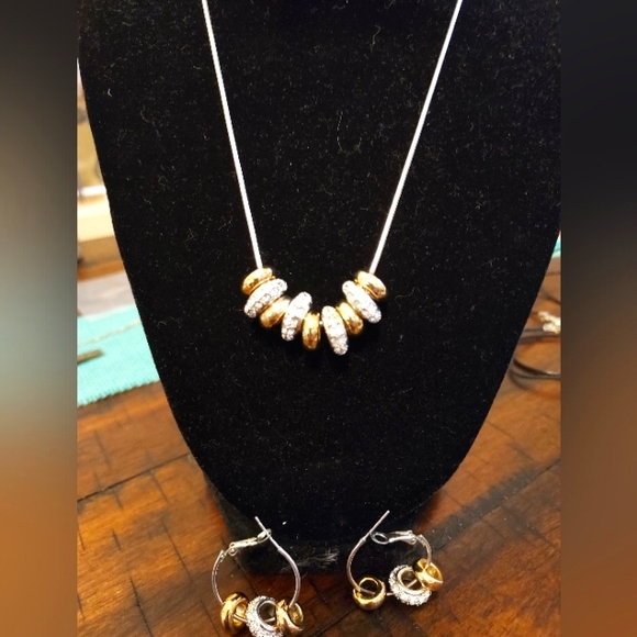 Pretty crystal gold and silver rings on silver chain removable crytals on necklass & small hoop earrings for a simple look or wear with all . Pretty set.