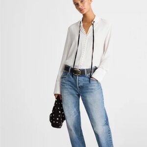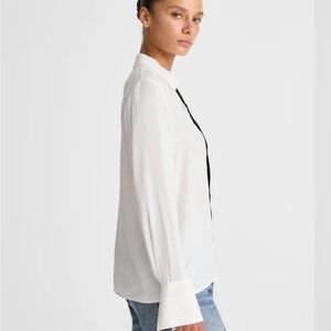 Crafted of an elevated silk-like fabric, this long-sleeved top features a removable velvet tie and stacked covered buttons at the front. Dress it up with trousers or jeans.