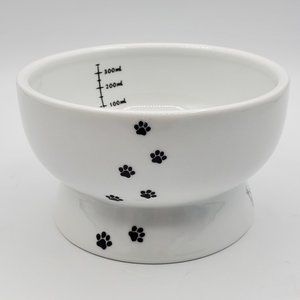 This adorable raised cat food bowl has cute paw prints going up the side and even has more useful items like measurement guidelines.