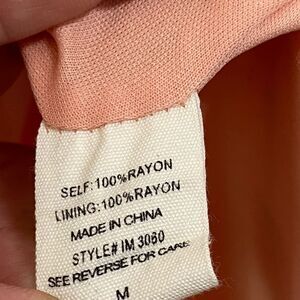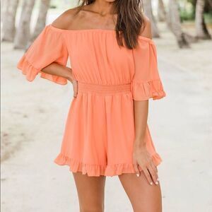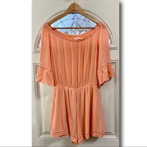 Peach color romper. Elastic waist. Crinkle fabric. Crochet detail at sleeves and legs.