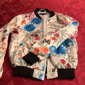 Nee Look size Med white flowery print Zip jacket 100 poly lining 100 poly shell