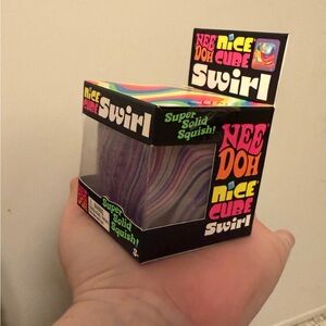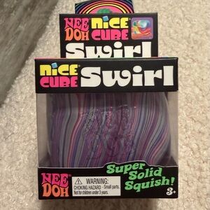 NeeDoh Nice Cube Swirl in a purple multi swirl. Soft, solid squish toy with vibrant marbled colors. Fun sensory stress-relief cube.