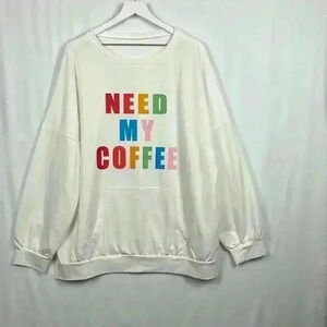 Need My Coffee Womens Sweatshirt White 2XL OS Colorful Block Print Loose Sleeves Cuffs Kangaroo Pocket Lightweight Casual Fun NWOT