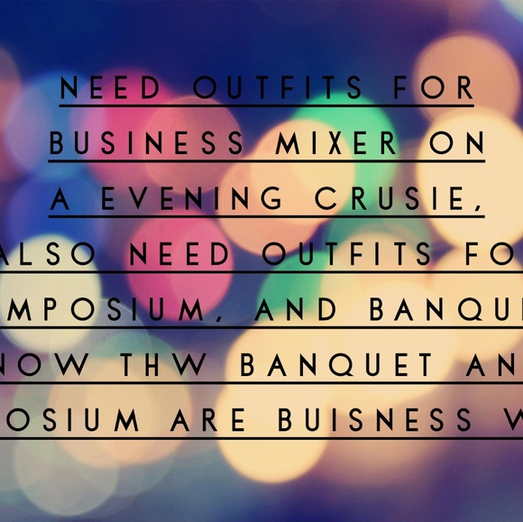 Need help finding outfits for Business Mixer on evening cruise. As well as something for Symposium and Banquet. Which are both buisness wear. Mixer is more casual