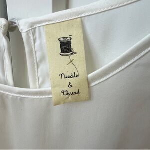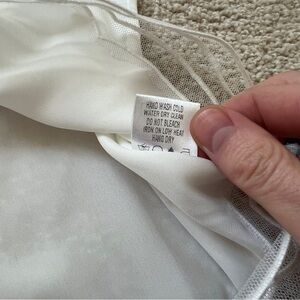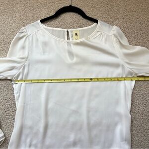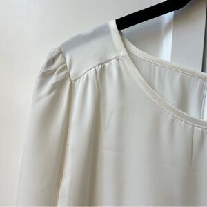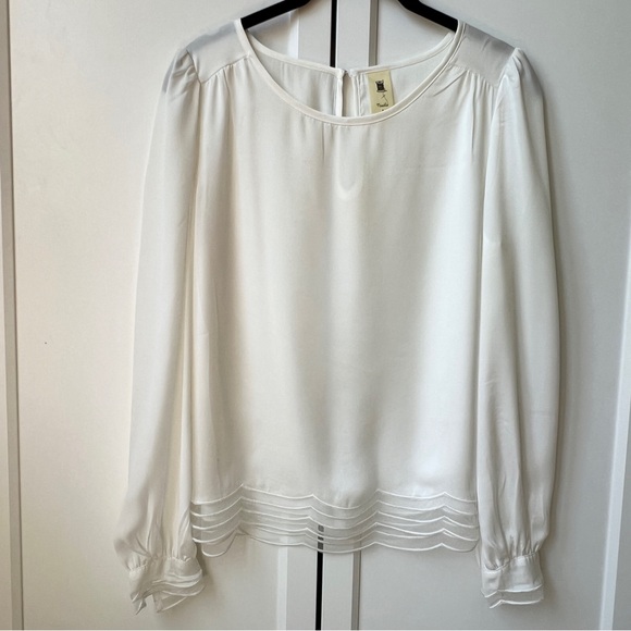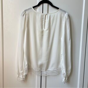 Never worn elegant off-white long sleeved blouse with mesh scalloped hemline and buttons at the wrists and at the back for a keyhole detail. Elegant and feminine! 🤍 has been in storage for a bit, so may have some lint. The fabric has a silky feeling to it.