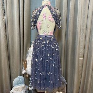 Beautiful blue embellished open back Comet midi dress by Needle & Thread. Iridescent florals upon light-as-air tulle create an air of romance while a triangular back cut out give the dress a sense of edginess.