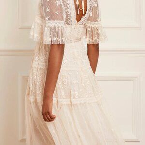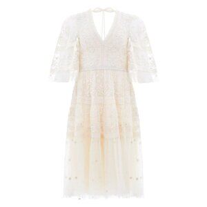 Elegant cream midi dress. Features delicate lace detailing. Short sleeves with ruffle trim. Perfect for special occasions.