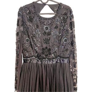 Features long sheer beaded sleeves, round neckline, open back, single button closure at the back of the neck, hidden zipper in the skirt, butterfly beaded bodice, ribbon at the waist, long tulle skirt, in Midnight blue