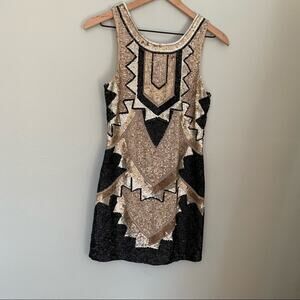 I absolutely adore this stunning high end European designer Needle & Thread gold/bronze/black intricately detailed sequin bodycon sleeveless form fitting mini dress