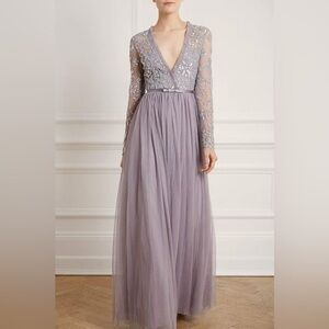 Needle & Thread Sequin Bodice Long Sleeve Maxi Gown Gray US 0 / UK 4