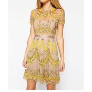 Needle & Thread Tiered Petal Embellished Tulle Dress in Beige Yellow Size 8