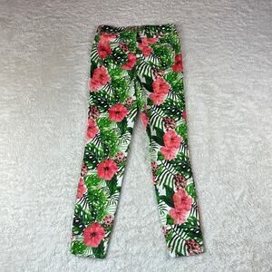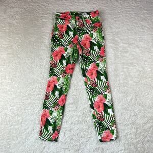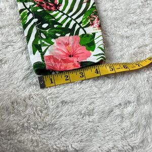 Vibrant white skinny jeans with tropical green fronds and pink florals. Nice amount of stretch.