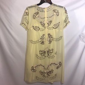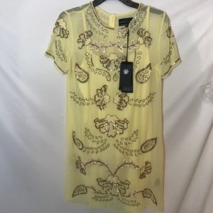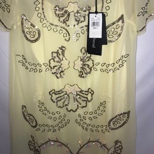 Shine on in this vintage-inspired shift dress. Embellished with beads and sequins in a gorgeous floral motif, this charming dress has a round neck and short sleeves.