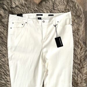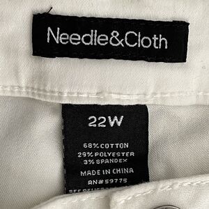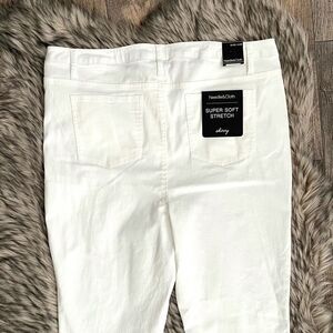 68%cotton, 29% polyester, 3%spandex•Fabric is super soft and stretchy for an all around comfortable fit. Features two back pockets, two front pockets, one coin pocket. Very chic and versatile. Flat Measurements Sz 22W- length 40”, inseam 29”, waist 20” across, rise 12”.