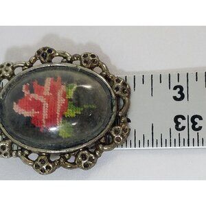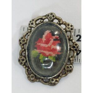This is a tiny cross-stitched rose design in a brooch. Gold tone metal with a clear plastic cover. The cover is slightly cloudy from age but this is a beautiful piece.