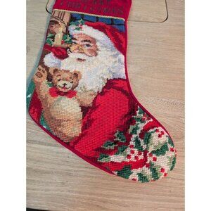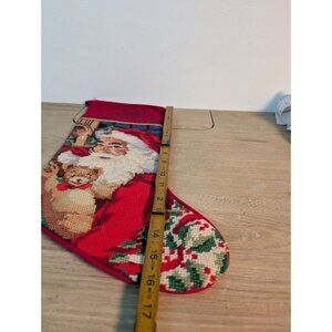 This charming Christmas stocking features a beloved character, Santa Claus, in a festive red velvet design. The intricate needlepoint details add a touch of elegance to this holiday accessory. Measuring 18 inches in length, this stocking is perfect for displaying on a fireplace mantel or anywhere else in your home.