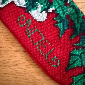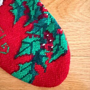 Needlepoint Santa Claus Noel Christmas Stocking. Vintage-looking Santa Claus with red berry holly and NOEL, Red velvet back. Red fabric hanger loop. Excellent pre-owned condition. No tag or fabric information. A few raised stitches on the front. One pulled thread on the back. Both flaws are minimal and hardly noticeable.. Approximately 19" from the top edge to the bottom toe edge.