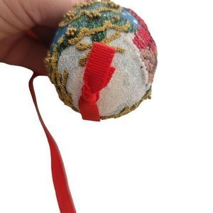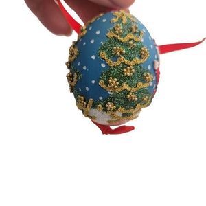 Needlepoint painted egg Christmas Ornament Santa Christmas Tree red ribbon