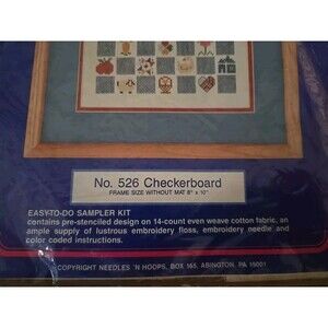 The product is a vintage pattern for a checkered board frame design, with the stencil and stitch number 526. The frame size without mat is 8x10 inches, suitable for needlecrafts and yarn projects such as crocheting and knitting.
