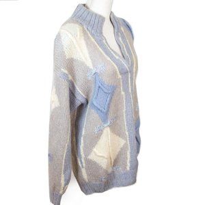 Beautiful Vintage Mohair Blend Sweater, oversized knit sweater featuring a V-neck opening beneath a mock or high collar. The pattern is a variation of argyle or a geometric diamond pattern, often associated with vintage styles from the 80s or 90s.