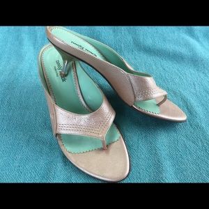 Metallic blush champagne color, small run designer sandals, made in Italy. Never worn, 2.25" kitten heel, EU size 40, foot bed length 10"--all leather.