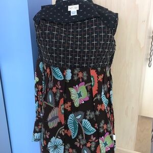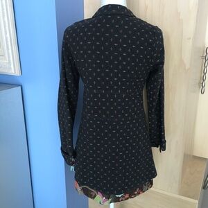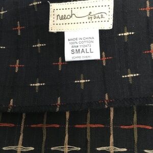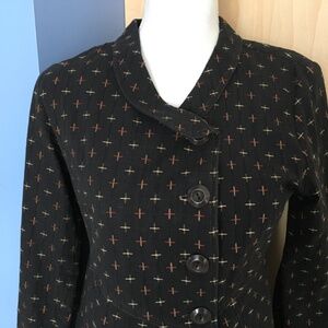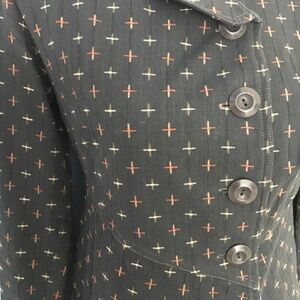 This mixed fabric button front jacket is from Neesh by D.A.R. It is all cotton. The black fabric is accented with small red and beige stitches and a bright and cheery floral lighter weight fabric lines the lower section of the jacket and hangs inches below as the lower section of the jacket. There are turn back cuffs. It is a size S with these measurements: