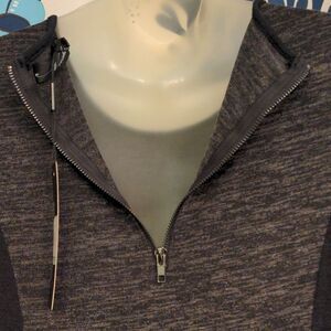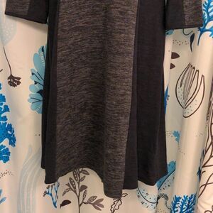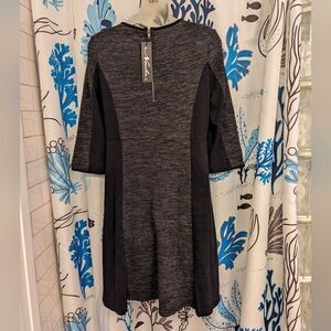 Two-tone black and charcoal heather grey dress. Back zipper, 3/4 length sleeves and sewn-in waist.