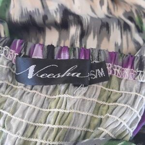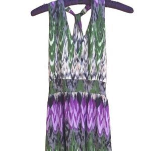 Gorgeous great weight wrinkle free material with a fun cream, green, purple, gray and black Ikat patterned halter with racerback detailing maxi dress.