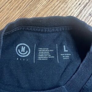 Neff graphic tee, men’s size large, classic black short sleeve crewneck, features colorful smiley face logo with rainbow lollipop design and bold “neff” lettering, 100% cotton, soft and pre-shrunk for comfort, great for skateboarding, streetwear, casual everyday wear, vibrant retro Y2K skater vibe, oversized relaxed fit, versatile wardrobe staple, measurements shown in photos for accuracy, in good pre-owned condition, skate core, streetwear core, casual core